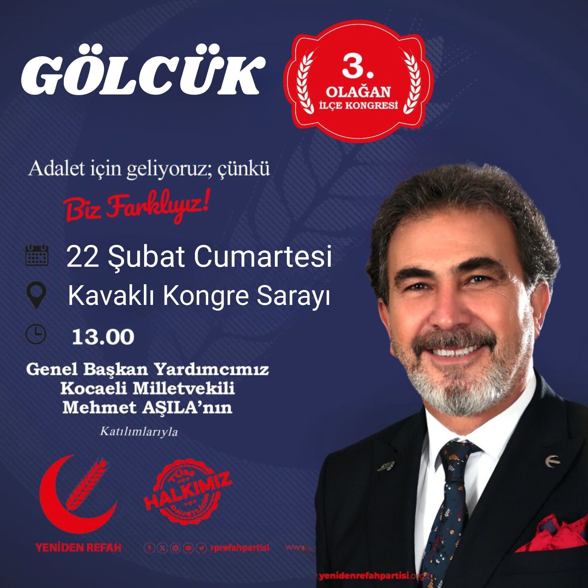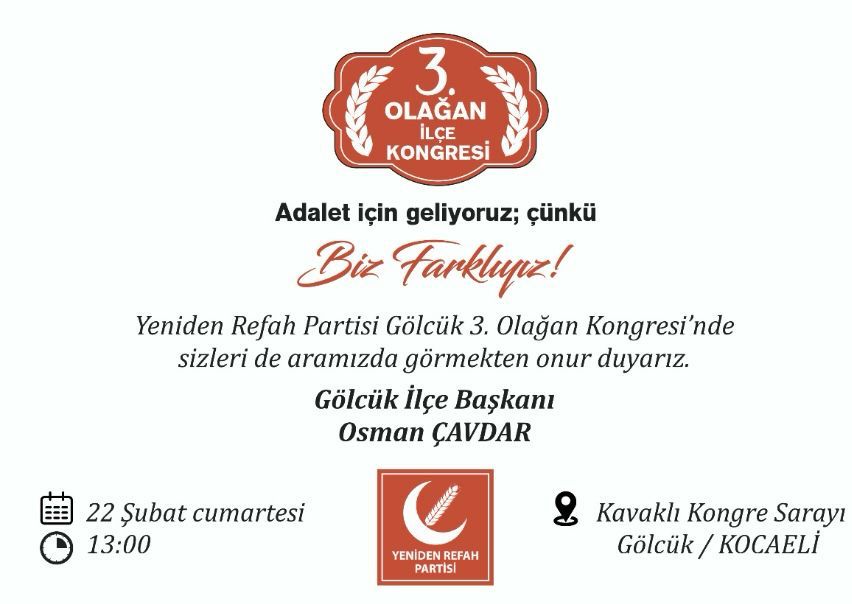 Yeniden Refah Partisi Gölcük 3. Olağan İlçe Kongresini gerçekleştirecek.