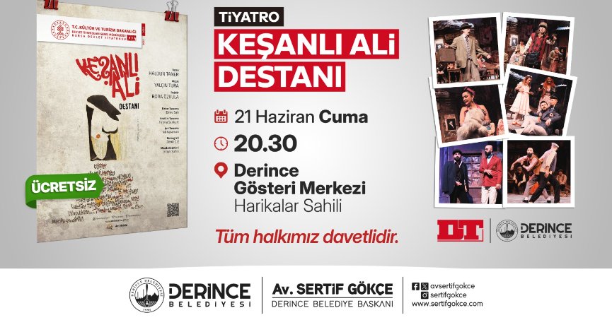 Derince Belediyesi, kültürel ve sanatsal etkinlikler kapsamında çok önemli bir eseri ilçe halkı ile buluşturuyor. Tiyatronun usta kalemi Haldun Taner'in yazdığı, müziklerini Yalçın Tura'nın yaptığı ve Bora Özkula'nın yönettiği, “Keşanlı Ali Destanı” tiyatro tarihinin başyapıtları arasında yer alıyor. Derince Belediyesi bu muhteşem eseri tiyatro severlerle buluşturacak. 21 Haziran Cuma günü saat 20.30’da Derince Gösteri Merkezi’ne ücretsiz olarak sergilenecek oyuna Derincelilerin yoğun ilgi göstermesi bekleniyor. İlk kez sahnelendiği 1964 yılından bu yana ilgiyle izlenen “Keşanlı Ali Destanı” Türk tiyatrosunun eşsiz klasikleri arasında yer alıyor.
