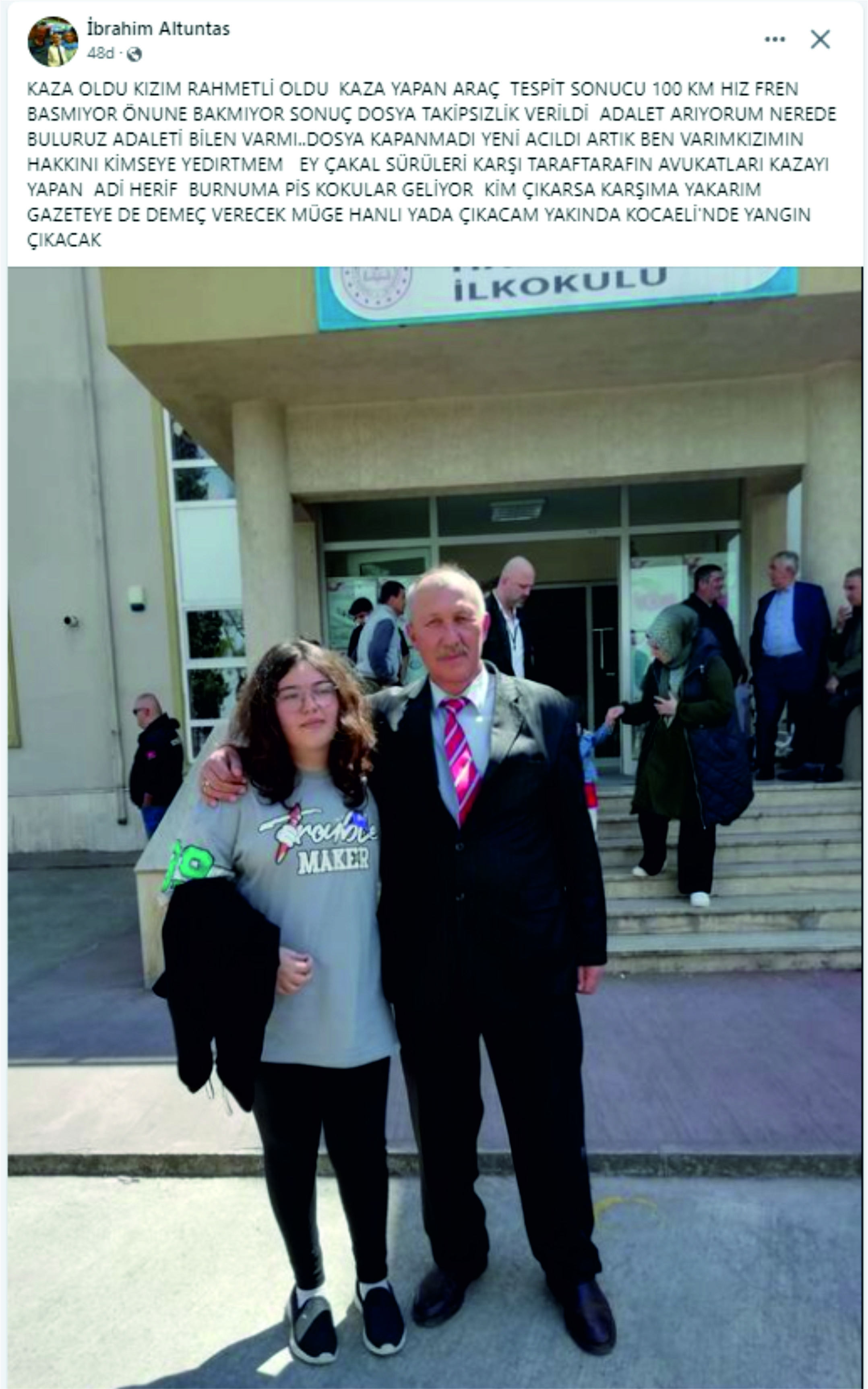 KAZA OLDU KIZIM RAHMETLİ OLDU KAZA YAPAN ARAÇ TESPİT SONUCU 100 KM HIZ FREN BASMIYOR ÖNUNE BAKMIYOR SONUÇ DOSYA TAKİPSIZLİK VERİLDİ ADALET ARIYORUM NEREDE BULURUZ ADALETİ BİLEN VARMI..DOSYA KAPANMADI YENİ ACILDI ARTIK BEN VARIMKIZIMIN HAKKINI KİMSEYE YEDIRTMEM EY ÇAKAL SÜRÜLERİ KARŞI TARAFTARAFIN AVUKATLARI KAZAYI YAPAN ADİ HERİF BURNUMA PİS KOKULAR GELİYOR KİM ÇIKARSA KARŞIMA YAKARIM GAZETEYE DE DEMEÇ VERECEK MÜGE HANLI YADA ÇIKACAM YAKINDA KOCAELİ'NDE YANGIN ÇIKACAK