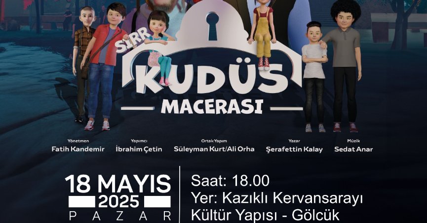 Gölcük Belediyesi ve Gölcük Kudüs Gönüllüleri Platformu işbirliğinde, Gölcüklü çocuklar Kudüs’te maceraya çıkacak. Etkinlik kapsamında Ana teması Mescid-i Aksa'nın yalnızlığı olan "Sırr: Kudüs Macerası" animasyon filmi, 18 Mayıs Pazar günü Kazıklı Kervansarayı Kültür Yapısı’nda ücretsiz olarak Gölcüklülerle buluşacak. Saat 18.00’da başlayacak film gösteriminde çocuklar, İstanbul’dan başlayarak Kudüs’e uzanan bir hikayede yolculuğa çıkacaklar.
